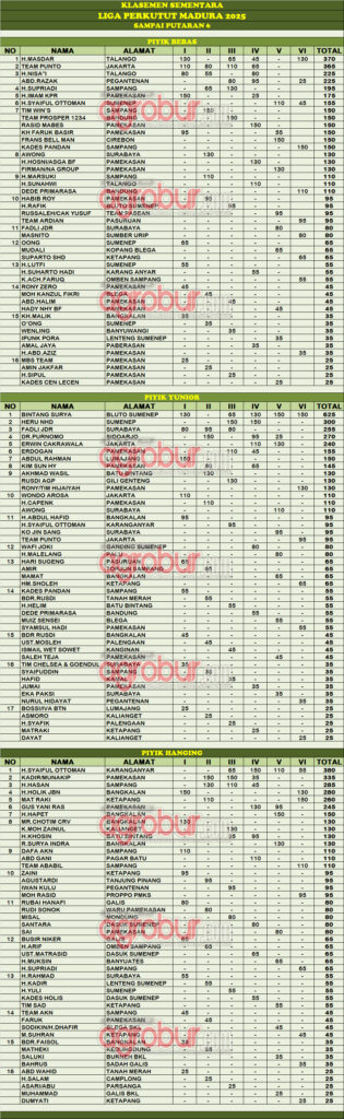Begitu juga di Kelas Dewasa Yunior yakni Paku Alam amunisi H.Fahmi Pamekasan produk ternak Naura (poin 670), Satria Muda andalan H.Nisa’i Talango Sumenep produk Skad (poin 470) dan Kemuning Prima orbitan Dede Primarasa Bandung, ternakan DKA (poin 285) masih memungkinkan terjadinya pergeseran posisi.