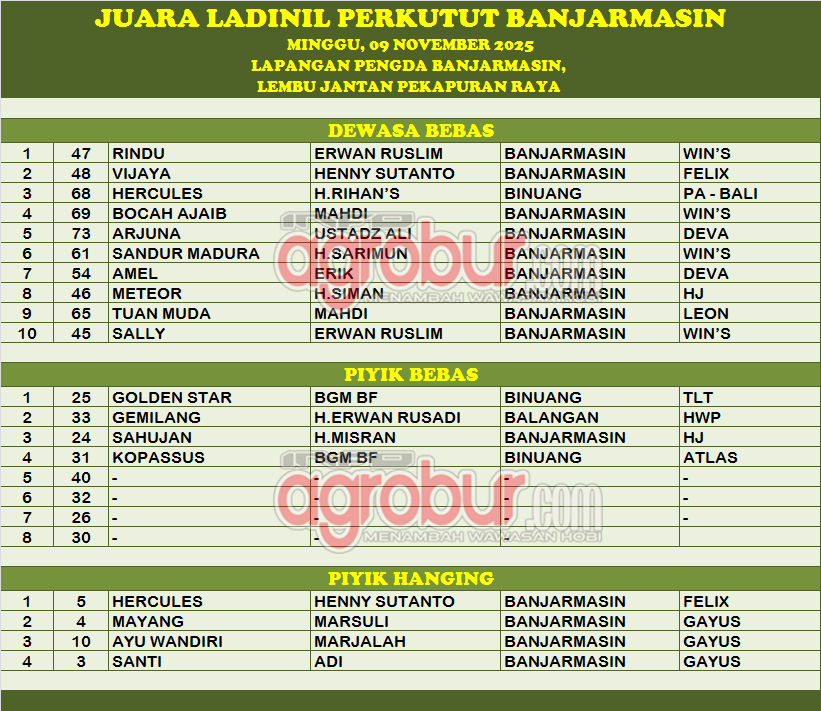Semangat peserta dalam mengikuti gelaran Latihan Dinilai Perkutut Pengda Banjarmasin Kalimantan Selatan yang dilaksanakan pada Minggu, 09 November 2025, patut diapresiasi. Pasalnya kondisi cuaca dan lokasi yang tidak normal, nampaknya bukan halangan bagi kung mania untuk membatalkan ataupun mengakhiri acara yang mereka hadiri.