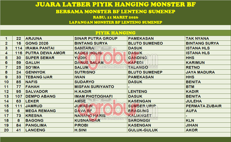 Bulan Ramadhan tidak menjadi penghalang bagi kung mania di Lenteng Sumenep untuk terus menjalin silaturahmi antar sesama. Lewat gelaran Latber Piyik Hanging yang diprakarsai oleh Monster Bird Farm Lenteng, Rabu 11 Maret 2026, pukul 13.00 sampai selesai, acara tersebut seakan menjadi bukti semangat yang terus ada di kalangan kung mania.