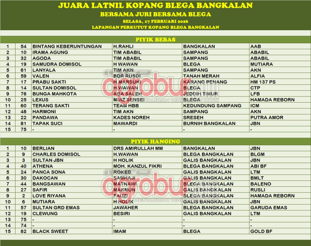 Lapangan perkutut yang berlokasi di Desa Kopang Kecamatan Blega Kabupaten Bangkalan kembali diramaikan oleh kehadiran kung mania pada Selas, 17 Februari 2026. Mereka hadir dalam rangka memenuhi undangan panitia LatNil Blega. Meski kegiatan ini terbilang hanya kalangan terbatas, namun peserta yang hadir mampu membuat jumlah blok yang disediakan penuh sesak.