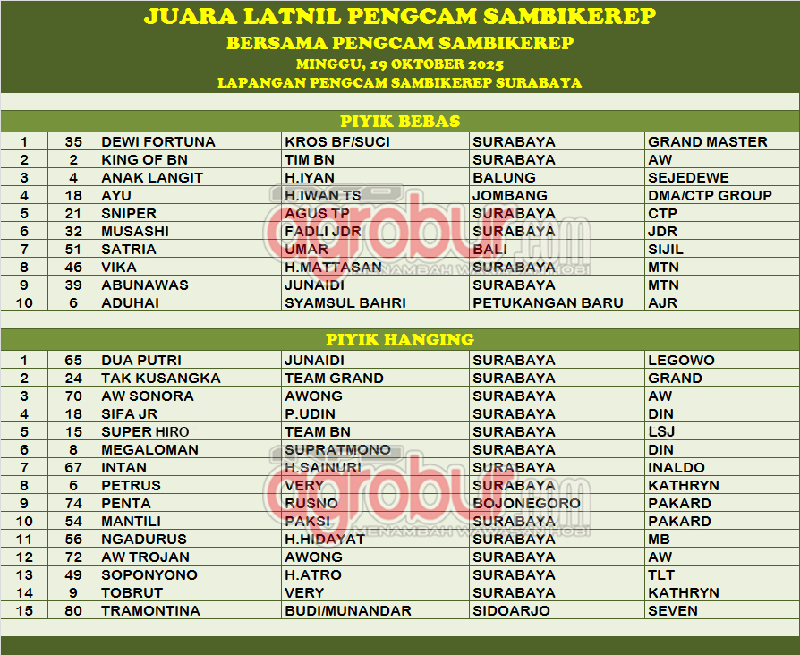 Di meja perumus, seluruh peserta direkap untuk menentukan posisi juara. Sampai akhirnya penentuan posisi kejuaraan ditentukan. Untuk podium pertama di Kelas Piyik Bebas berhasil menjadi milik Dewi Fortuna amuniai Kros BF/Suci Surabaya, perkutut ternakan Grand Master yang dikerek pada nomor 35.