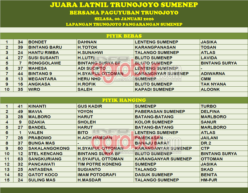 Dan tenpat ketiga dimenangkan Hantu Rimb, orbitan H.Sunahwi Talango Sumenep, produk ternak Atlas yang menempati nomor kerekan 24. Untuk Kelas Piyik Hanging, podium pertama berhasil menjadi milik Kinanti, amunisi Gus Kadir Sumenep, ring Turbo yang digantang pada nomor 41.