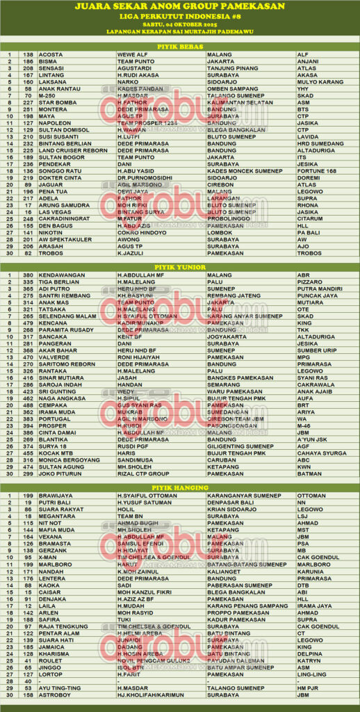 Gelaran Akbar Liga Perkutut Indonesia Putaran 8, bertajuk Sekar Anom Group Pamekasan yang dimulai Sabtu, 04 Oktober 2025 berlangsung sukses dan lancar. Sebanyak enam belas blok peserta (Piyik Bebas 6 blok, Piyik Yunior 6 blok dan Piyik Hanging 4 blok), ikut ambil bagian dalam kegiatan yang digelar menggunakan lapangan Kerapan Sapi Murtajih Pademawu.