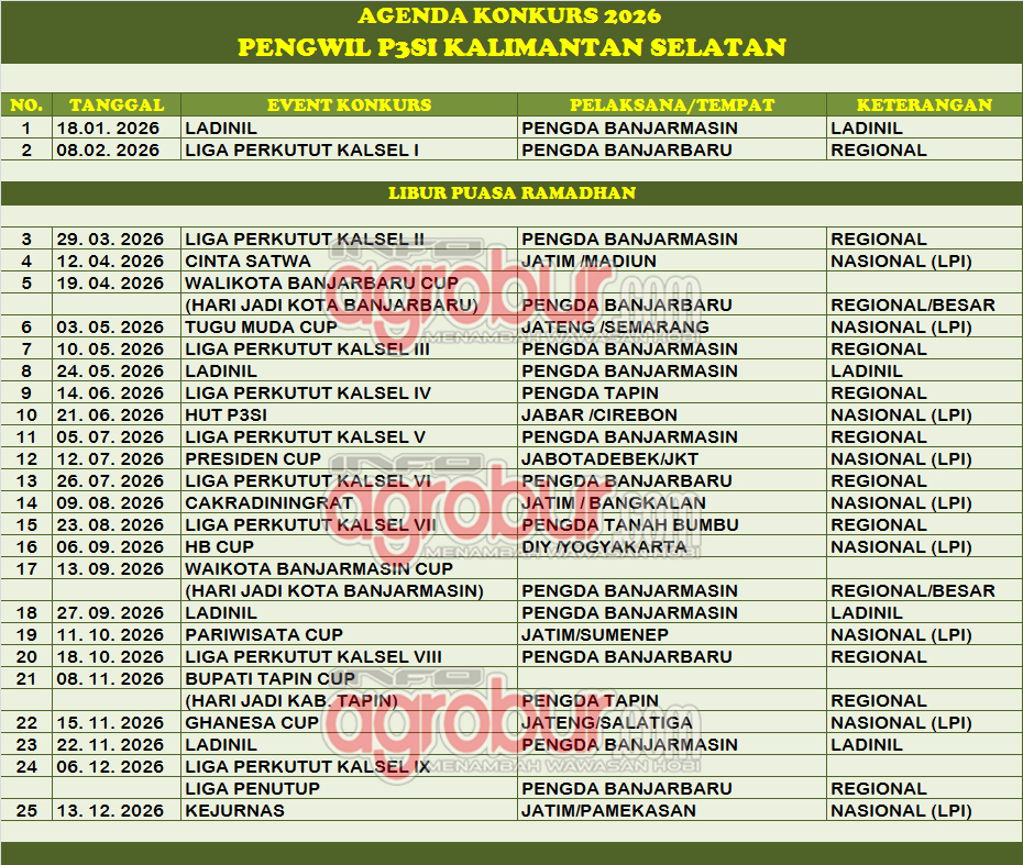 Penyusunan agenda konkurs di Kalimantna Selatan tahun 2026 menjadi fokus bahasan yang banyak dibicarakan. Ketua Pengwil P3SI Kalimantan Selatan H. Winardi Sethiono banyak memberikan arahan dan menyampaikan masukan bahwa pada tahun 2026 ini terkait konkurs yang akan digelar.